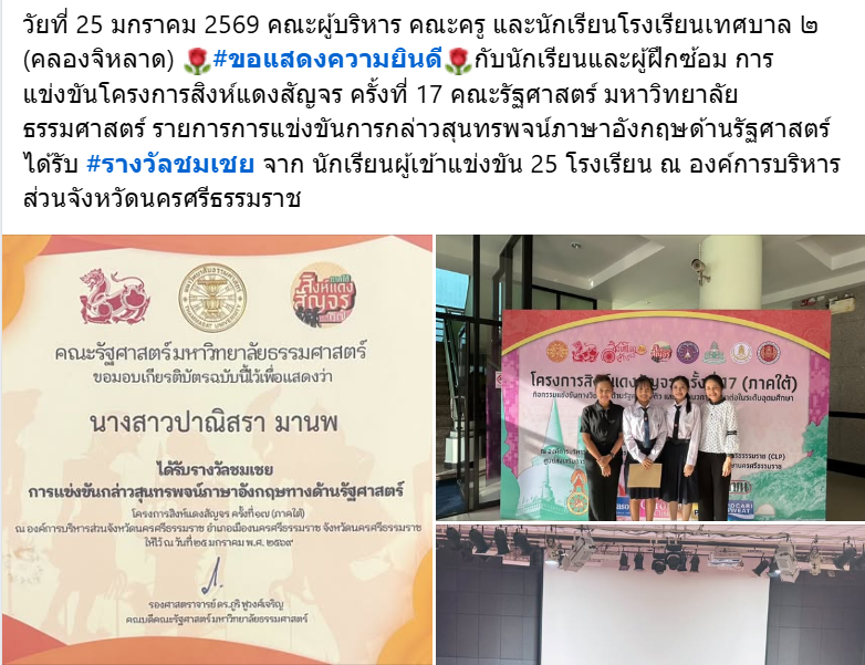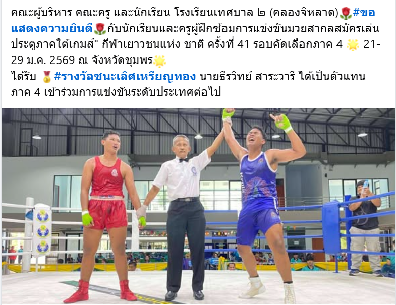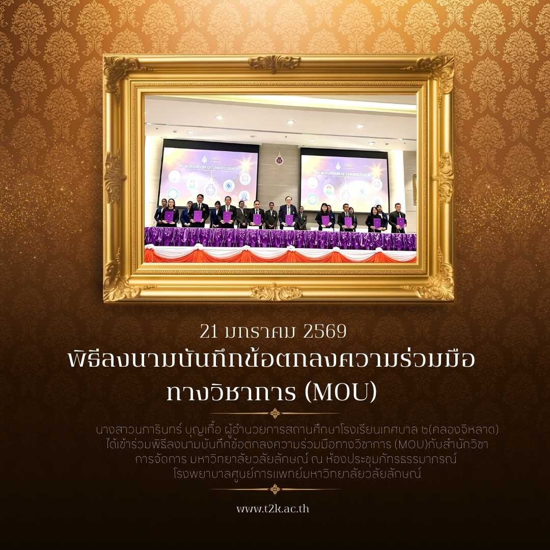 เมื่อวันที่ 21 มกราคม 2569 นางสาวนภาพรินทร์ บุญเกื้อ ผู้อำนวยการสถานศึกษาโรงเรียนเทศบาล ๒(คลองจิหลาด)ได้เข้าร่วมพิธีลงนามบันทึกข้อตกลงความร่วมมือทางวิชาการ (MOU)กับสำนักวิชาการจัดการ มหาวิทยาลัยวลัยลักษณ์ ณ ห้องประชุมภัทรธรรมาภรณ์ โรงพยาบาลศูนย์การแพทย์มห