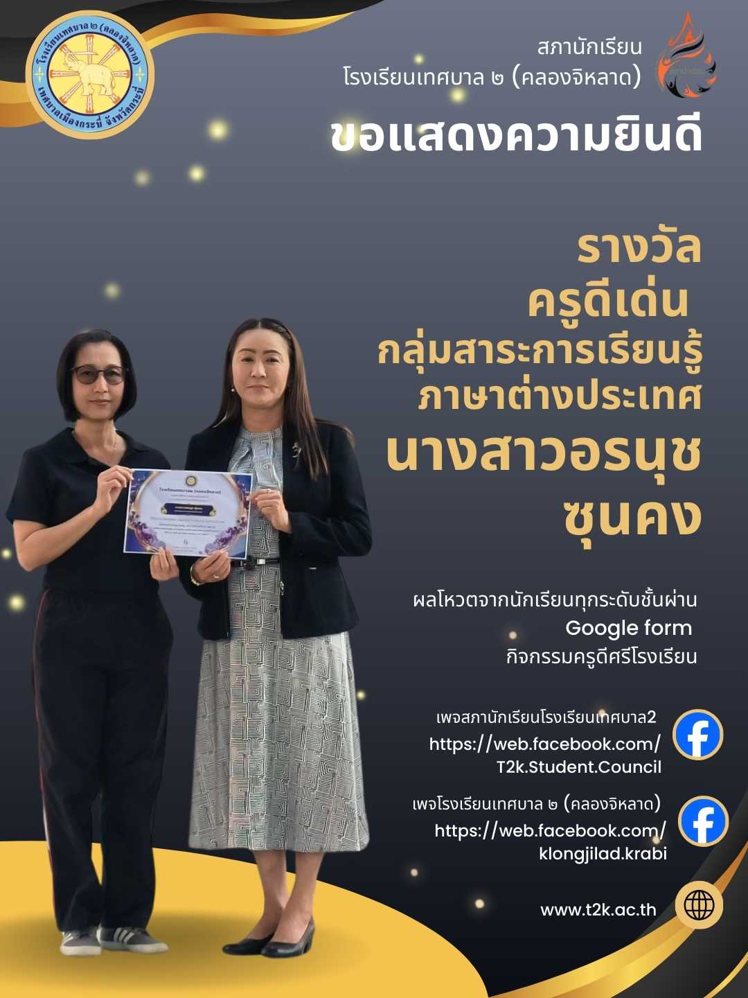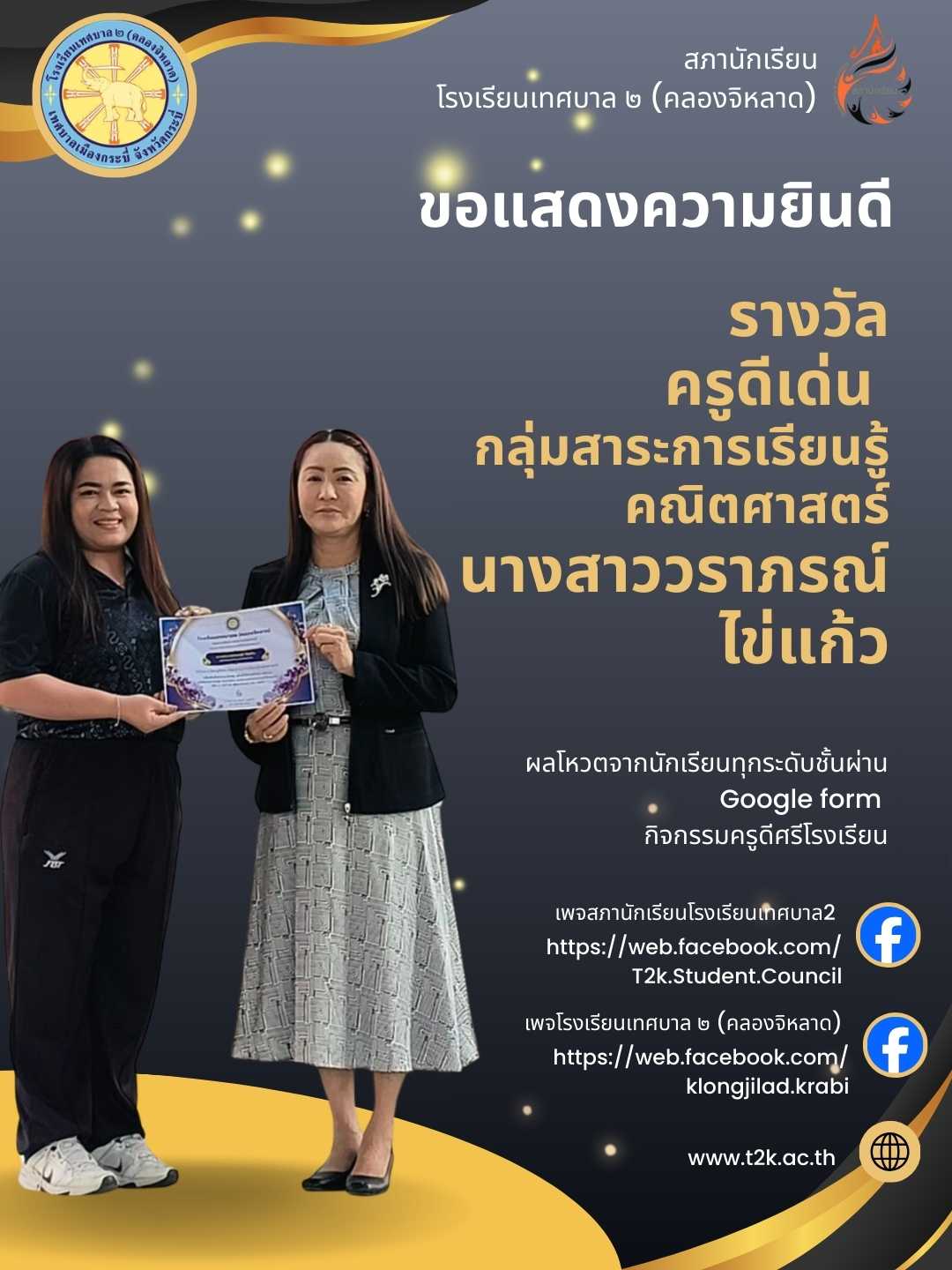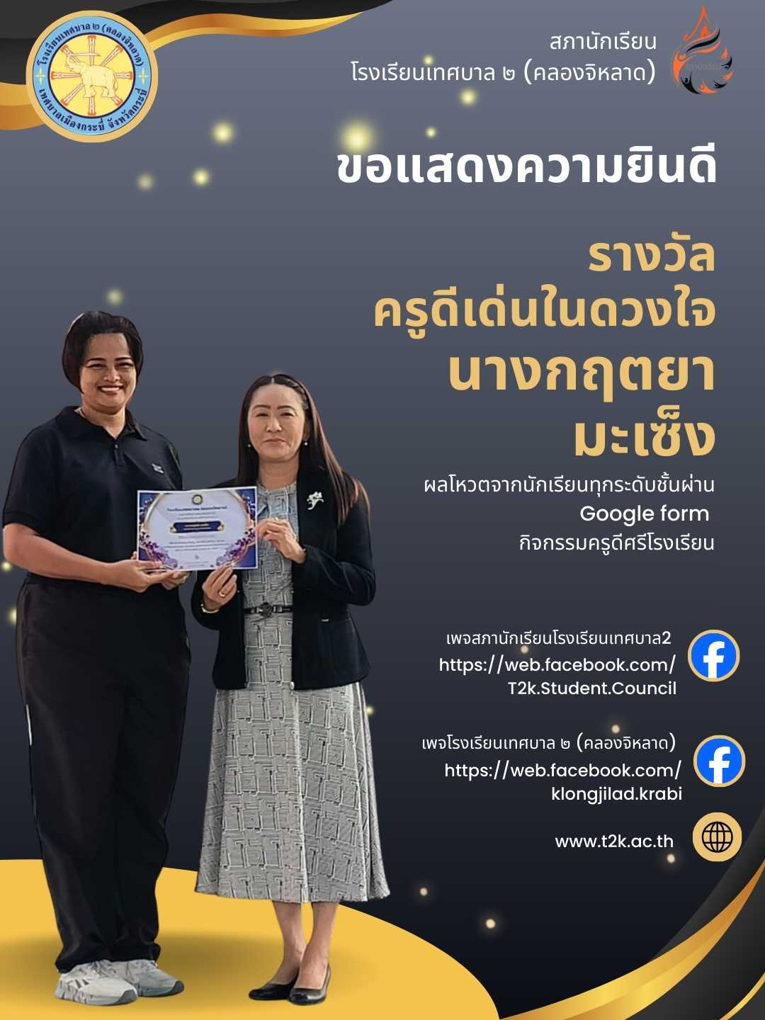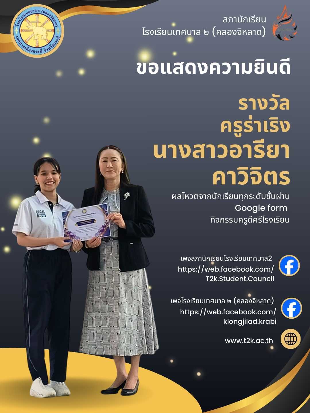 ขอแสดงความยินดีกับนางสาวกฤดิชนก ศิลปรัตน์ ที่ได้รับรางวัลรองชนะเลิศ อันดับ 1 จากโครงการ การประกวดมัคคุเทศก์น้อย ครั้งที่ 8 ในงาน ม.อ.วิชาการ ประจำปีการศึกษา 2565