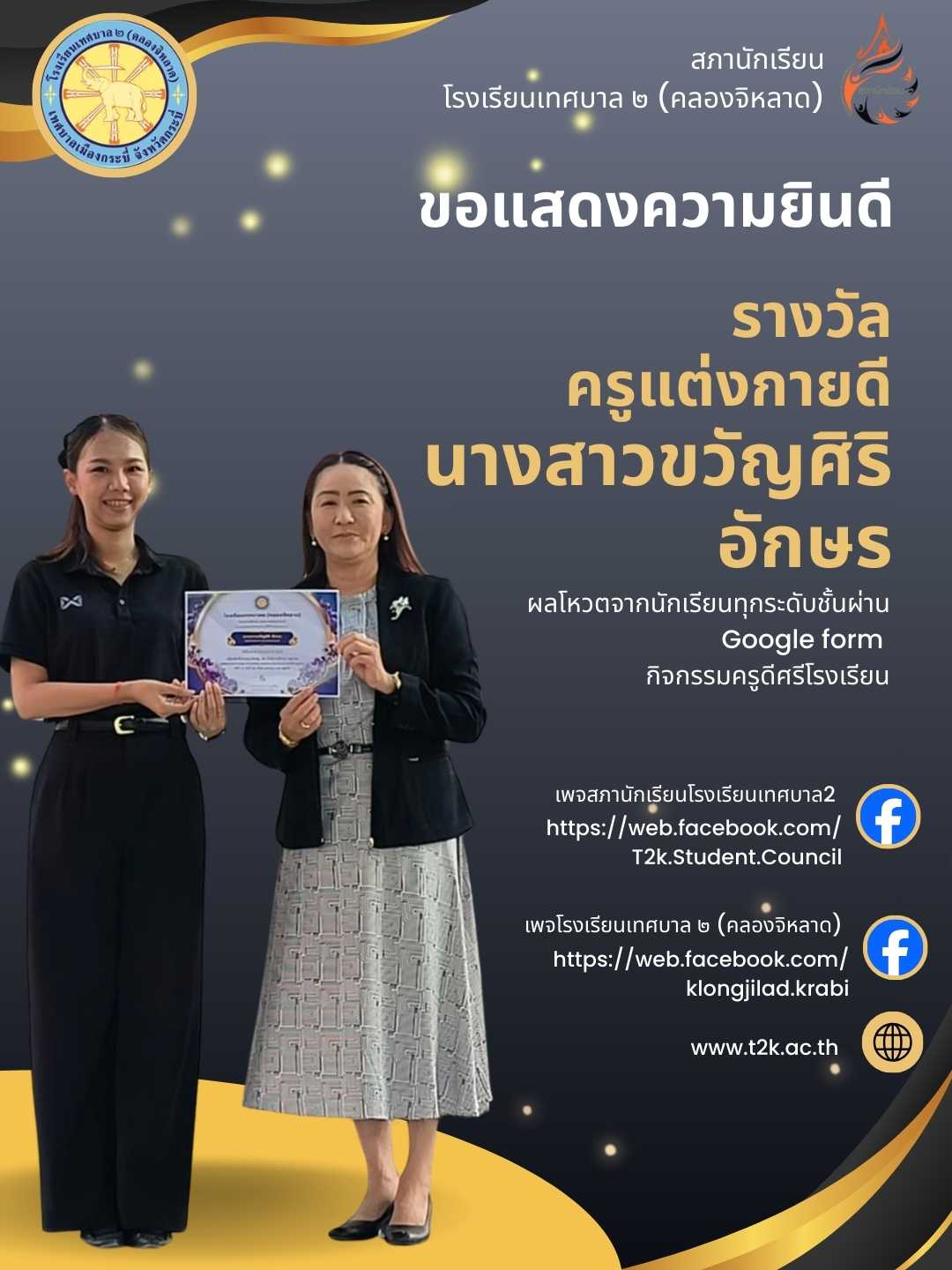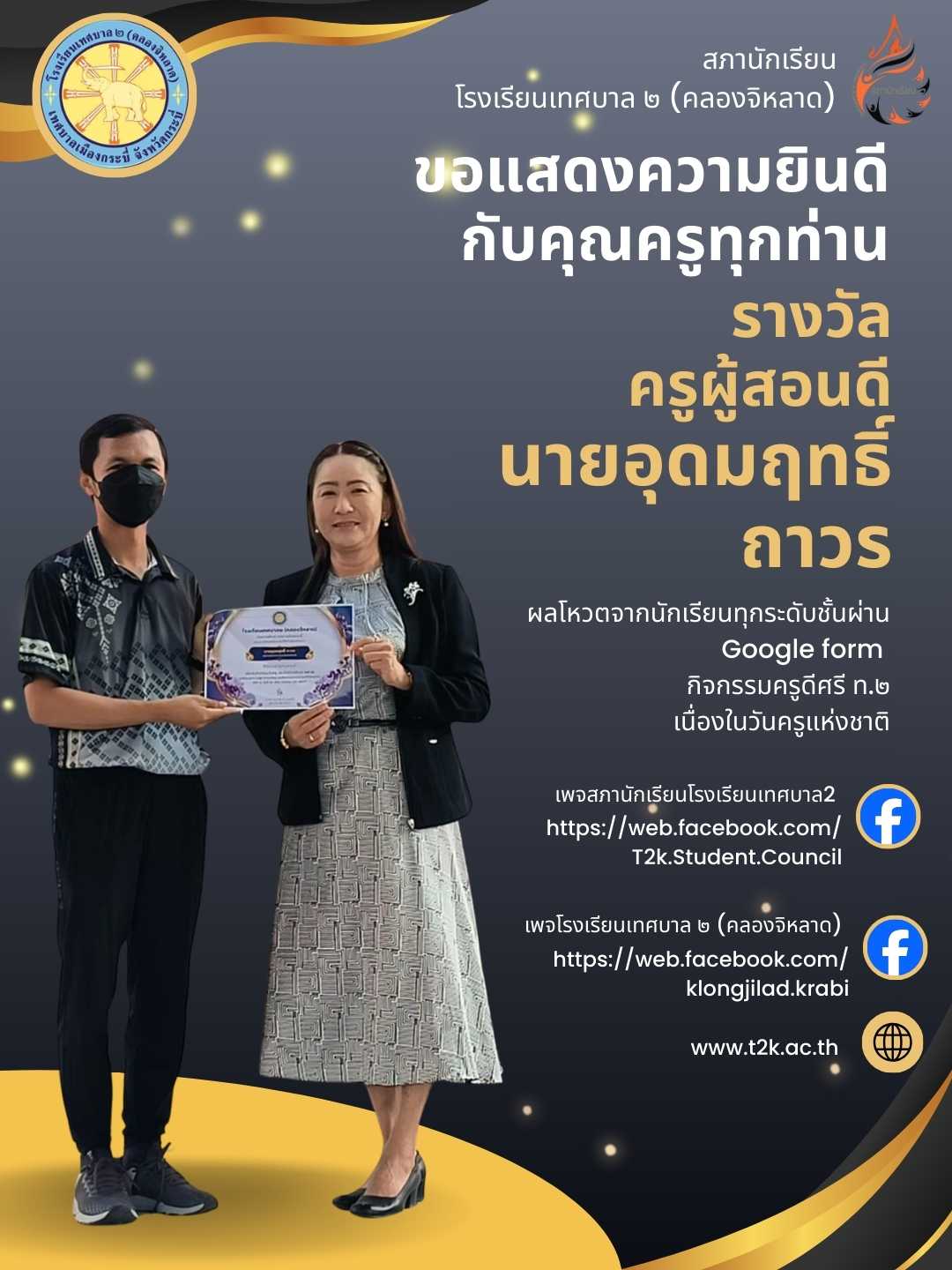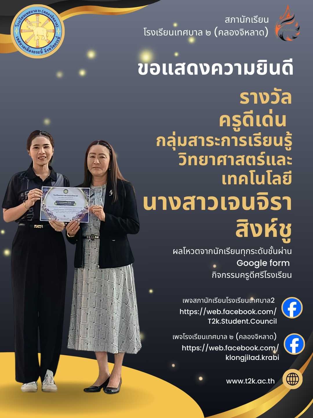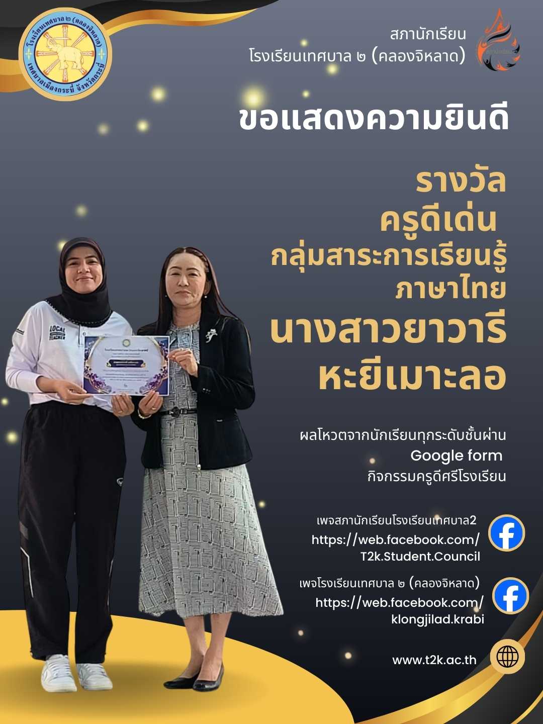 ขอแสดงความยินดีกับนางสาวกฤดิชนก ศิลปรัตน์ ที่ได้รับรางวัลรองชนะเลิศ อันดับ 1 จากโครงการ การประกวดมัคคุเทศก์น้อย ครั้งที่ 8 ในงาน ม.อ.วิชาการ ประจำปีการศึกษา 2565