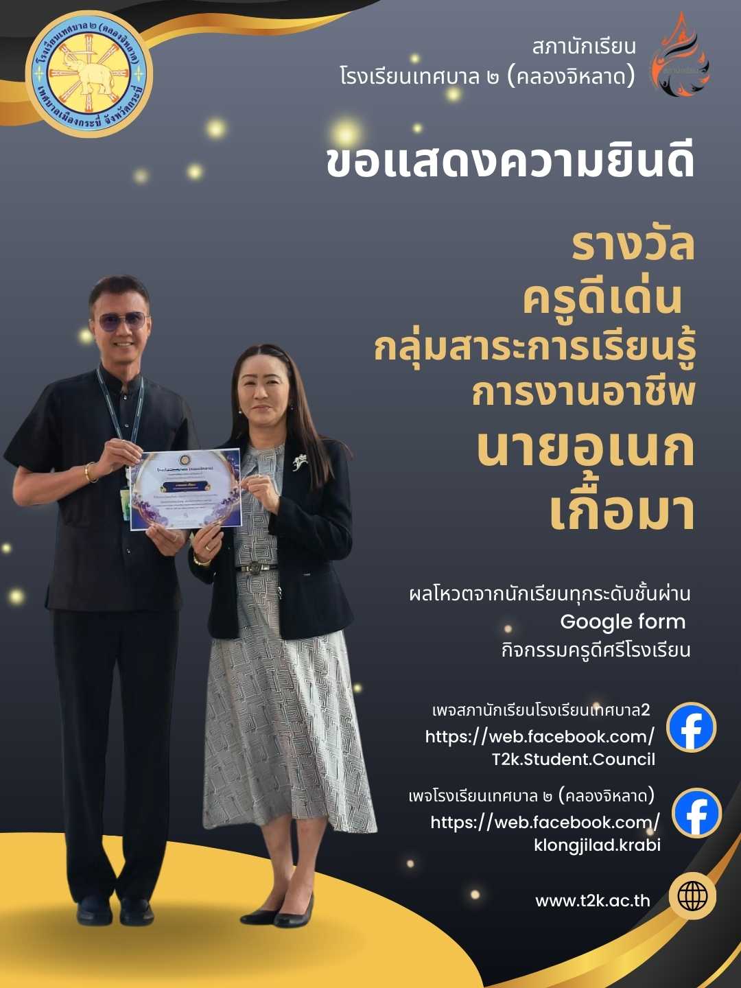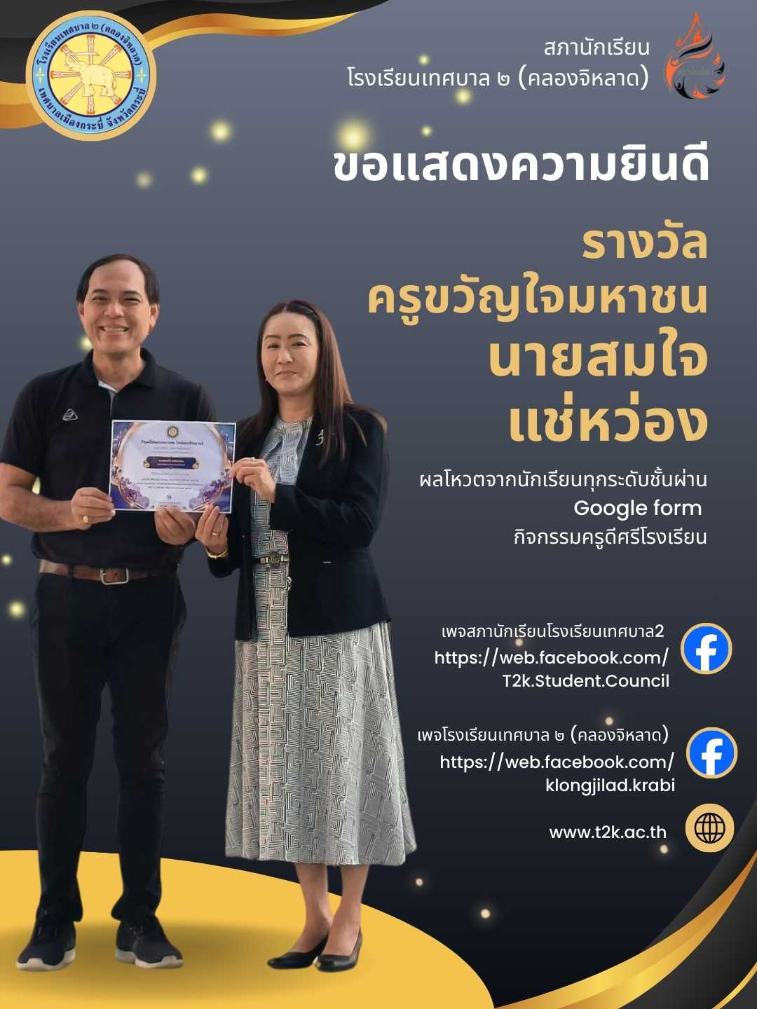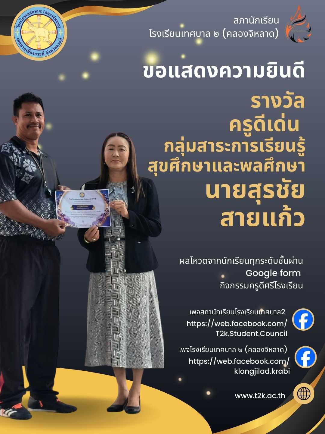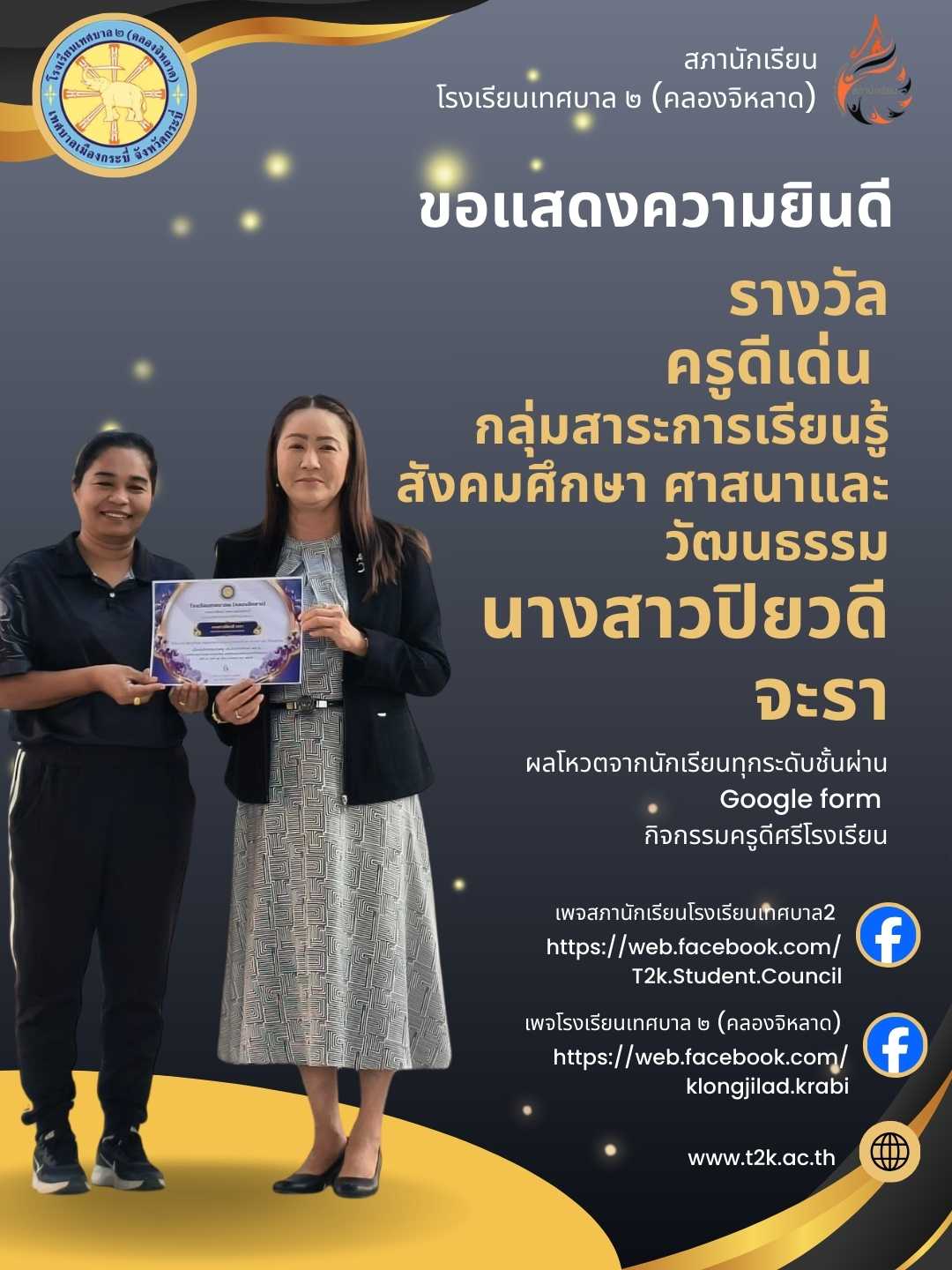 ขอแสดงความยินดีกับนางสาวกฤดิชนก ศิลปรัตน์ ที่ได้รับรางวัลรองชนะเลิศ อันดับ 1 จากโครงการ การประกวดมัคคุเทศก์น้อย ครั้งที่ 8 ในงาน ม.อ.วิชาการ ประจำปีการศึกษา 2565