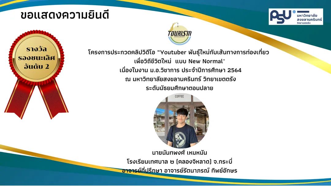ขอแสดงความยินดีกับนายนันทพงศ์ เหมหมัน ที่ได้รับรางวัลรองชนะเลิศอันดับ 2 การประกวดคลิปวิดีโอส่งเสริมกสรท่องเที่ยว